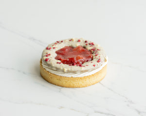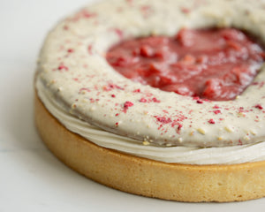 A tart as lovely as Mom! Strawberry-rhubarb compote, roasted rhubarb, and silky cream cheese whipped ganache sit in a buttery vanilla shell with a hidden crunch of feuillantine cookie. Glazed in Ivoire white chocolate, sprinkled with almonds & freeze-dried raspberries—it's sweet, tangy, and made with love.